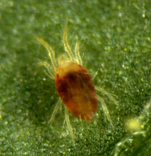 - Etapas de desarrollo : los huevos (1) (figura 9) se depositan principalmente en el envés de los folíolos. Son redondos, diminutos (0,14 mm de diámetro), translúcidos al principio, luego se vuelven opacos y finalmente se vuelven amarillos a medida que se acercan a la eclosión. Las larvas (2) (figura 10), que tienen 3 pares de patas, son inicialmente muy pálidas, luego adquieren un tinte verdoso. Tienen dos manchas de ojos rojos y dos manchas oscuras en el medio de su cuerpo. Las protoninfas más grandes (3) tienen cuatro pares de patas y varían en color de verde claro a verde oscuro; también tienen dos puntos más contrastantes en su cuerpo. Las deutoninfas (4) son más grandes que las protoninfas pero del mismo color. Es en la etapa adulta (5) (figuras 11 y 12) donde podemos distinguir los machos de las hembras: la hembra, ovalada, mide de 0,5 a 0,6 mm de longitud. Su color es variable (naranja, amarillo claro, verde claro a verde oscuro, incluso rojo). El macho es más activo, más pequeño y estrecho que la hembra. También tiene un color variable (amarillo claro a naranja, amarillo oscuro a marrón). En tomate, T. urticae es frecuentemente rojizo.
