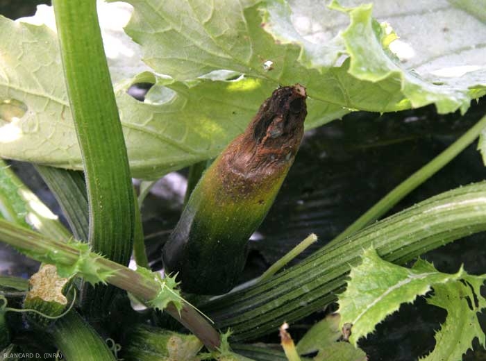 Cabe señalar que un cierto número de hongos oportunistas son capaces de asentarse en los frutos y hacer que se pudran a través de las lesiones provocadas por la necrosis apical: Botrytis cinerea , Didymella bryoniae , Choanephora cucubitarum , Fusarium spp. .
