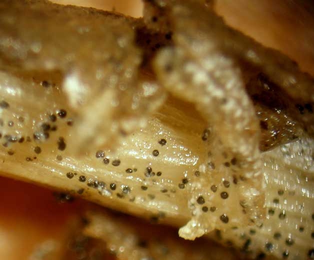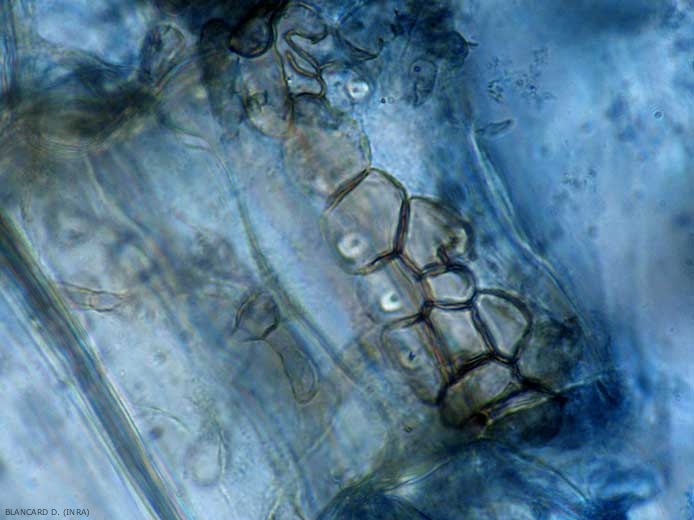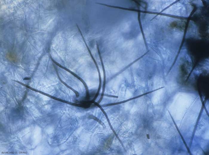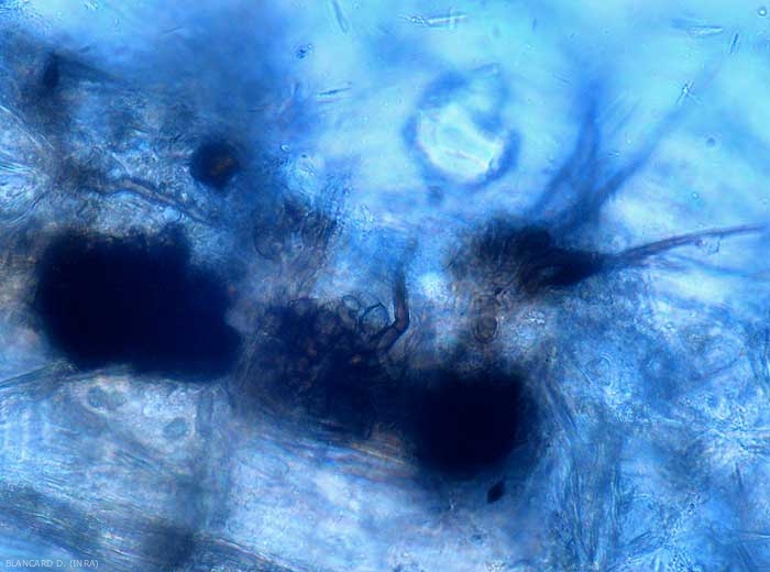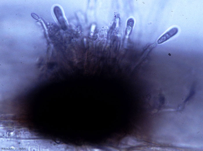 - Acervules intra ou sous-épidermiques, matérialisant sa multiplication asexuée (figures ). Ces structures, de 200 à 300 µm de diamètre, produisent des conidies cylindriques, hyalines et non cloisonnées (16-24 x 3-7,5 µm) qui sont immergées dans une matrice gélatineuse qui les protège ;