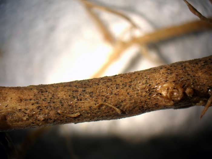- Bioagresseurs parfois associés : Thanatephorus cucumeris (Rhizoctonia solani), Fusarium oxysporum f. sp. radicis-lycopersici, F. solani, Pyrenochaeta lycopersici, Pythium debaryanum, Phytophthora nicotianae, plusieurs espèces de Meloidogyne et Globodera tabacum, etc.
