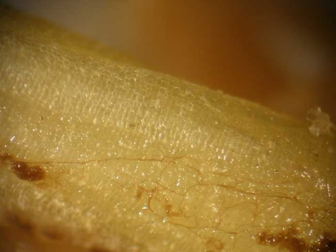 - Discrets filaments mycéliens bruns isolés ou réunis en cordons parfois plutôt denses se développant superficiellement sur les tissus altérés ou à proximité (mycélium brun) (figures 11 à 15) ;