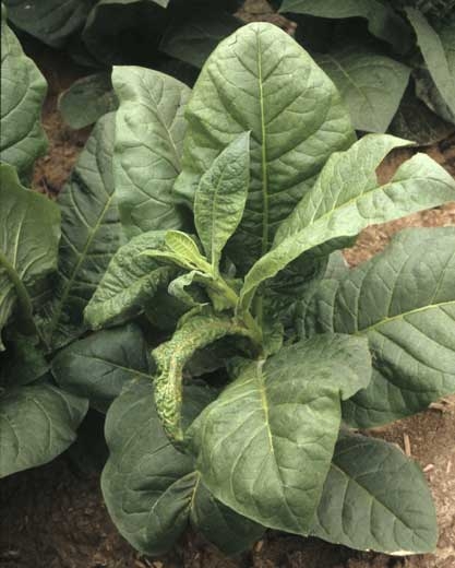 Des lésions allongées brunes à noires sont présentes sur les nervures, les pétioles et la tige (figure 4). Le sommet de cette dernière s'incurve parfois vers le sol (figure 5).