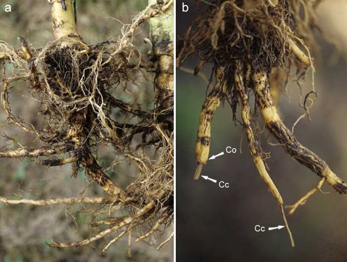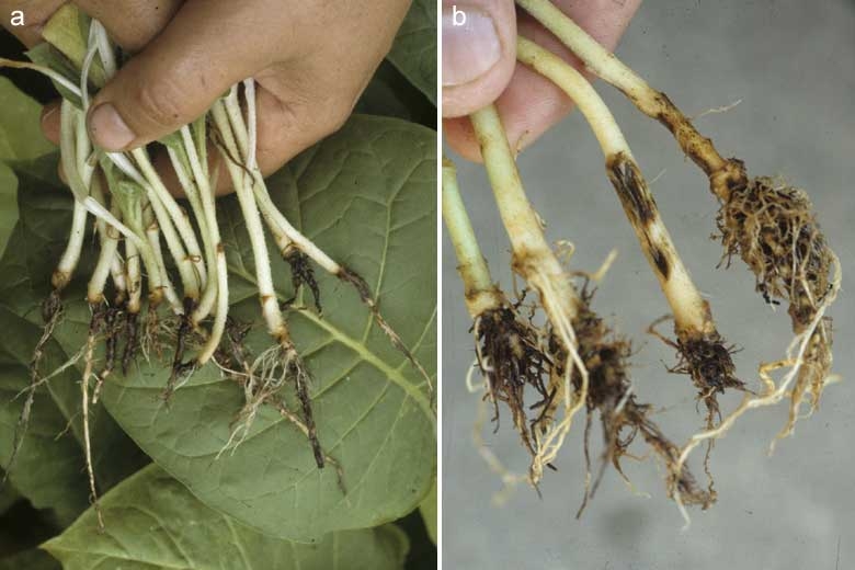 Thielaviopsis basicola est un champignon du sol qui se développe aussi bien en pépinière (figures 1 et 2) qu'au champ. Il est responsable d'importants dégâts sur la partie souterraine des plantes. Il colonise progressivement les racines, provoquant de nombreuses altérations brunes à noires sur toute leur longueur et détruisant une grande partie des radicelles nourricières (figure 3). A terme une proportion importante du système racinaire présente une pourriture noire assez caractéristique (figure 4). Les grosses racines, un peu moins sensibles, portent des manchons superficiellement subérisés de couleur brune à noire (figures 5 et 6).