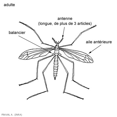 - apodes avec la tête distincte chez les nématocères ("cousins" ou Tipulidae, moustiques, etc., voir schéma) ;