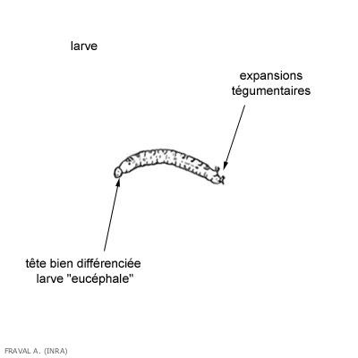 - la tête est non différenciée chez les cyclorraphes ou brachycères (voir schéma), ce type de larve est nommé asticot. La nymphe des cyclorraphes reste enfermée dans la dépouille larvaire du dernier stade ; l'ensemble est appelée pupe.