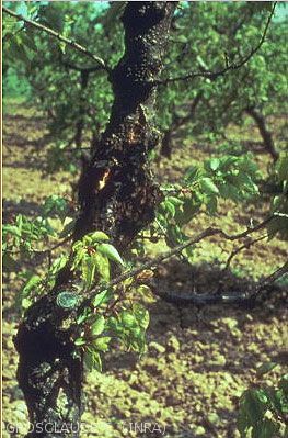 Eutypa armeniaca est un parasite fongique grave de l'abricotier. On oberve en été un flétrissement brusque de toute une branche, les feuilles restent attachées à l'arbre et le bois devient cassant. Un chancre s'est développé à la base de cette branche le plus souvent sur une ancienne plaie de taille. (figure 4)