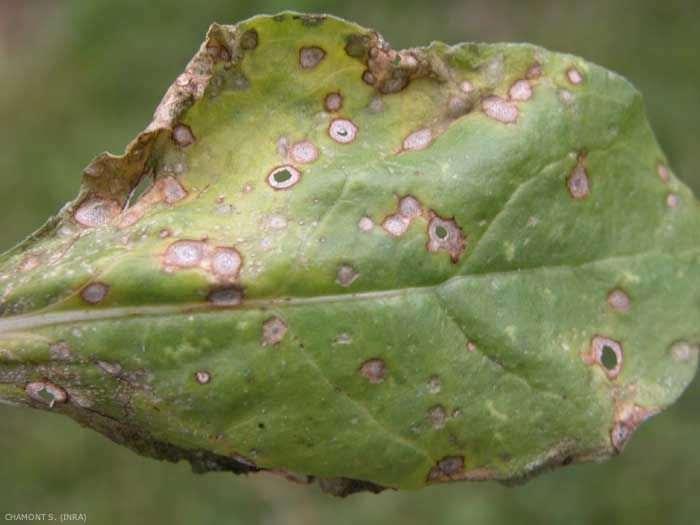 En cultures maraichères, la maladie la plus fréquente est la cercosporiose (figure 4), favorisée par les conditions humides (matinées fraiches à rosée). Caractérisée par des petites taches rondes bordées de sombre et causée par le champignon Cercospora beticola (Ascomycota, Dothideomycetes), ce parasite peut fortement affecter le feuillage, le rendant inapte à la commercialisation.