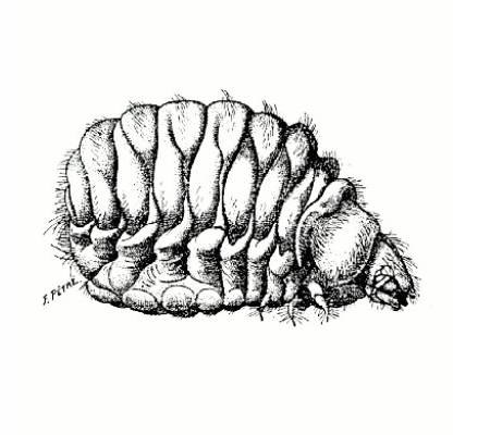 L'oeuf est blanc jaunâtre. La larve primaire est cylindrique, brune, et porte de longues soies ; la larve secondaire est massive, trapézoïdale, avec de fortes rides transversales et recouverte de soies rougeâtres (figure 4).