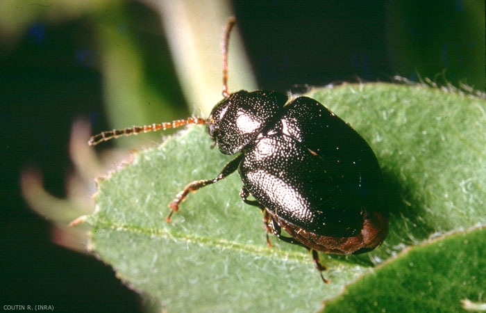 L'adulte présente un corps noir brillant, hémisphérique, il mesure 4 à 6 mm de long (figure 1). La tête est large. Lorsque la femelle est prête à pondre, son abdomen distendu par les oeufs provoque un relèvement des élytres et apparaît comme une masse orangée.