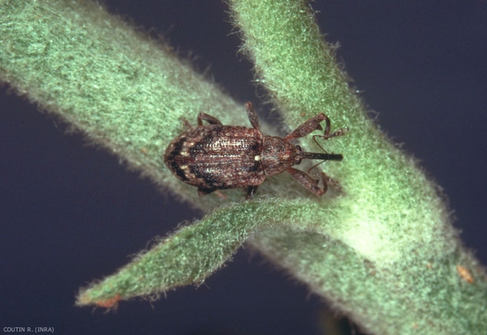 L'adulte mesure 4,5 à 5 mm de long (figure 1). Le corps est brun noirâtre recouvert d'une fine pubescence grise. Une bande grise clair en forme de V est présente sur la partie postérieure des élytres. Le rostre mesure environ 1/3 du corps.