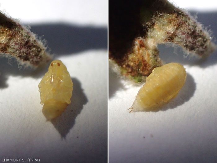 La larve mesure 6 à 8 mm, elle est plus effilée que la plupart des larves de curculionidae (figure 2). La tête est noire. Par ailleurs, la larve est apode, blanc jaunâtre.