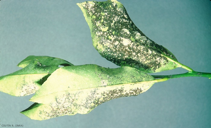 Ce sont les agrumes qui sont les plus affectés. En cas d'infestation très importante, des essaims de millions d'adultes peuvent se déplacer d'un lieu à un autre en provoquant des nuisances. La production de miellat, qui tombe sur la face supérieure des feuilles situées au dessous, est très élevée : feuilles et fruits se couvrent de fumagine (figure 2).