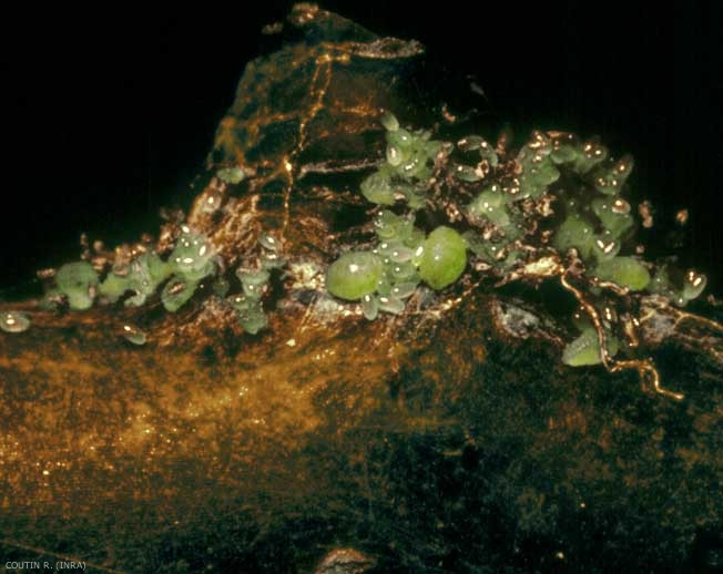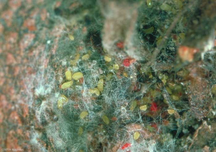 La prise de nourriture par les femelles cachées dans la cavité pistillaire entraîne la formation de larges plages noires, un symptôme appelé "cul noir" ou "nécrose de l'oeil" (figure 2) et qui ressemble assez à une attaque précoce de Botrytis cinerea.