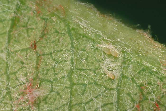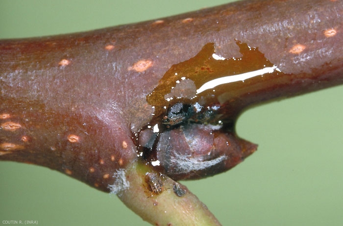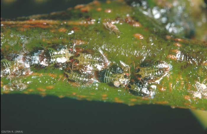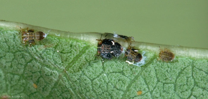 Par leurs piqûres, les larves et les adultes absorbent une grande quantité de sève, ce qui se traduit par un épuisement de l'arbre et une diminution de la récolte. Le miellat provoque des brûlures du feuillage et le développement de la fumagine (figure 5). Les attaques graves entraînent la chute partielle des feuilles dans le courant du mois d'août.