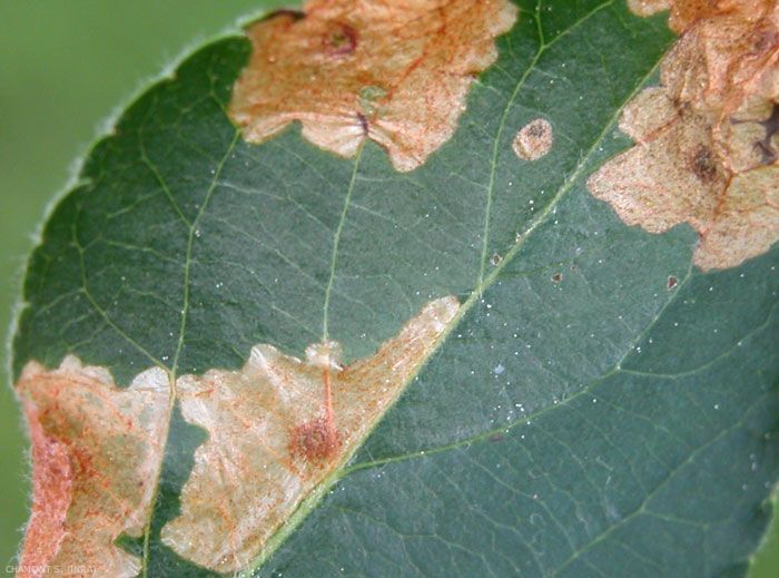 Les chenilles creusent des mines rondes ou rectangulaires dans les feuilles, sans les déformer (figure 4). Au printemps, elles dévorent en partie les bourgeons et les jeunes feuilles. En cas de débourrement tardif, les bourgeons sont très attaqués et la récolte peut être réduite. Les dégâts d'automne sont insignifiants. Ce ravageur cause rarement des pertes importantes.