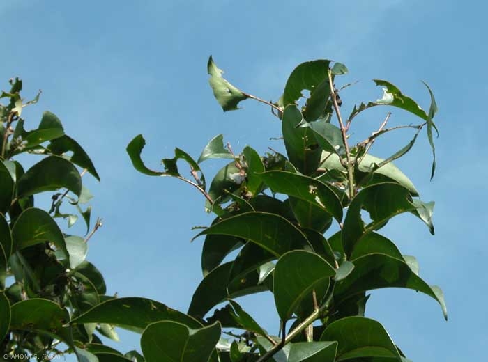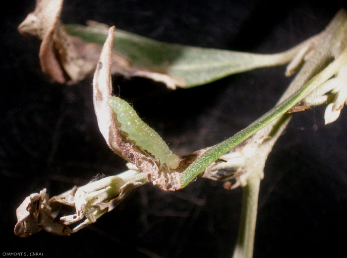 Les larves de 1er stade nouveau-nées décapent le parenchyme de la face inférieure des feuilles. Les chenilles s'alimentent de feuilles jeunes situées à l'extrémité des rameaux, en décapant d'abord une face, puis en découpant le limbe. Plus âgées, les chenilles provoquent des découpures dans les feuilles et peuvent détruire des bourgeons terminaux (figure 6). Les chenilles de la 2ème génération s'attaquent aux olives en formation, les rongeant, parfois jusqu'au noyau.