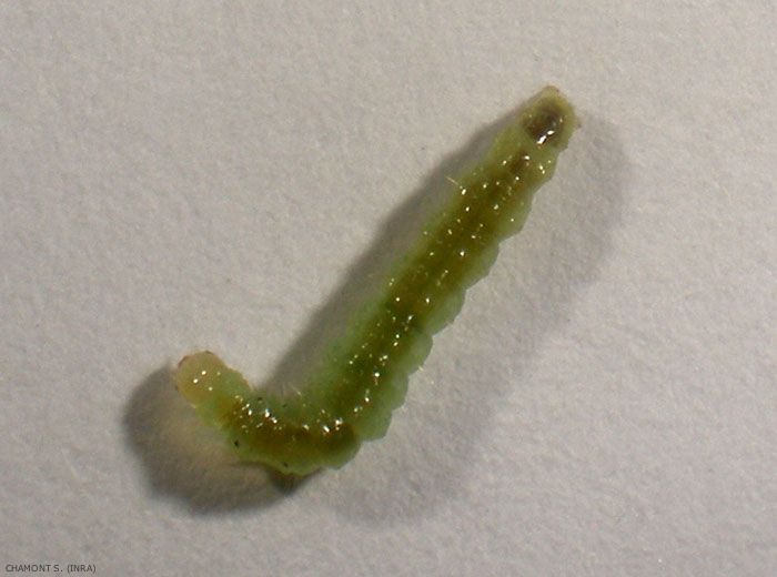 L'oeuf est de forme ovalaire, aplati, blanc jaunâtre, finement réticulé de 1 mm de long et 0,5 mm de large. La larve présente un corps jaune pâle à l'éclosion, devenant vert de plus en plus prononcé avec 3 paires de petites soies disposées latéralement sur chaque segment. A son complet développement, la chenille mesure 18 à 20 mm de long (figure 3).