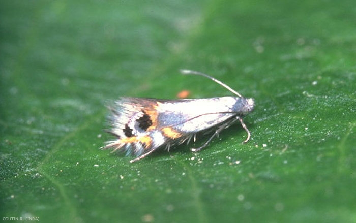 L'adulte mesure 6 à 7 mm d'envergure, les ailes antérieures sont blanc grisâtres et brillantes avec une strie brunâtre sur la moitié proximale, entourée de zones cuivrées, blanches et noires. Les ailes postérieures sont gris clair et frangées (figure 1).