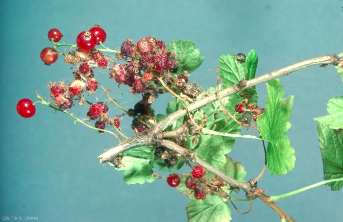 Les baies de Ribes spp. attaquées présentent une modification de leur coloration ; elles prennent une teinte rose puis rougeâtre plus ou moins foncé pour les plus grosses d'entre elles, couleur trompeuse qui correspond à une fausse maturité parmi les autres baies restées vertes.