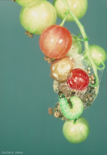 La durée de croissance de la larve est de 2 mois environ. La chenille nouveau-née pénètre dans une 1ère baie dont elle consomme le contenu, puis, tissant des fils de soie qui réunissent plusieurs baies voisines, pénètre dans une 2ème puis une 3ème baie, parfois une 4ème (figure 5).