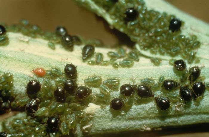 Les colonies sont particulièrement populeuses à la base des capitules et sur les feuilles caulinaires (figure 2) de ses hôtes secondaires.