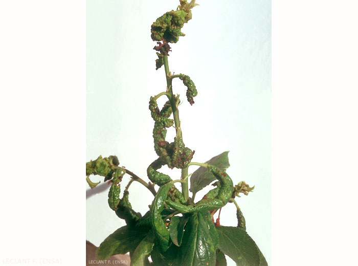 Sous l'action des piqûres des fondatrices et de leur descendance, les feuilles du prunier se crispent très fortement, s'enroulent et s'appliquent le long de la tige (figures 1 et 2). Sur le tournesol, les pucerons se localisent sur les feuilles qui se crispent. Ils gagnent ensuite les capitules et forment des colonies denses entre les graines. Sur l'artichaut, les bractées rougissent et durcissent. Par ailleurs, ce puceron est l'un des vecteurs du virus de la sharka (PPV, Plum pox virus), virus très redouté dans les vergers.