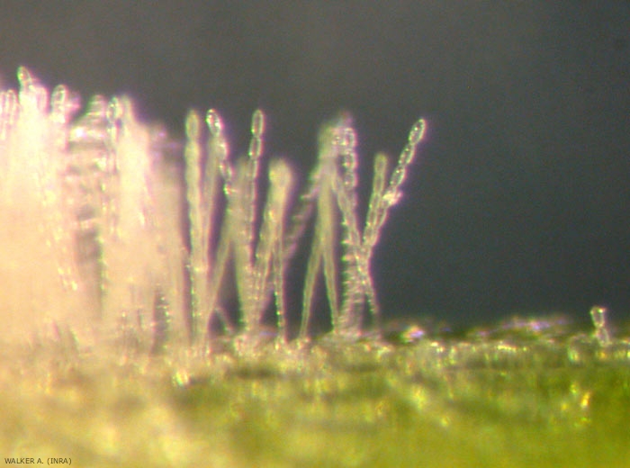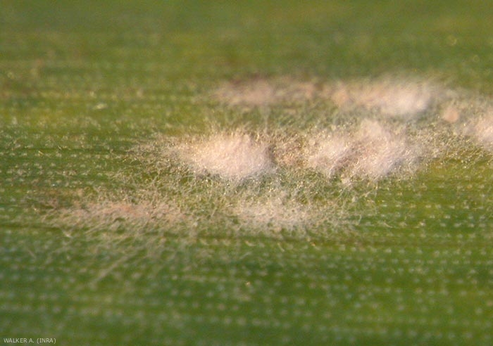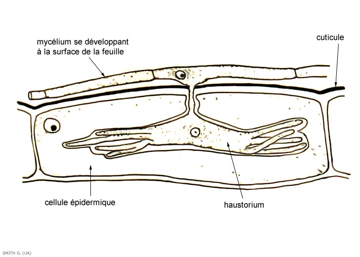 Ce champignon, parasite obligatoire, est formé d'un mycélium superficiel qui se développe à la surface des organes contaminés (figure 1). Des hyphes spécialisés lui permettent d'extraire les nutriments de la plante hôte en pénétrant les cellules épidermiques de l'hôte grâce à des organes suceurs appelés haustoria (figure 2).