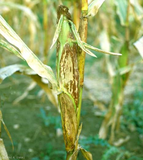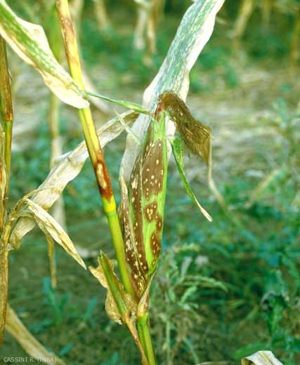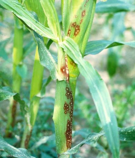 Avec le développement du champignon, les lésions peuvent confluer et former ainsi de grandes zones nécrotiques. De ce fait, la feuille entière se dessèche et donnent ainsi un aspect coup de gel au feuillage. Le développement du champignon peut atteindre les gaines des feuilles, les spathes voire les tiges.