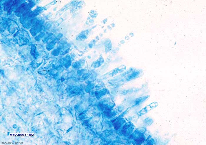 Le mycélium circule dans l'ensemble du parenchyme sous forme d'éléments isolés intercellulaires (dans les méats, figure 1). Le diamètre des hyphes est très variable suivant la profondeur du tissu et l'âge des feuilles.