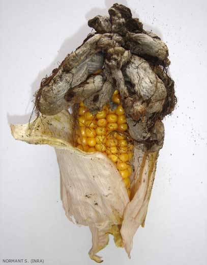 Ustilago maydis, s'attaquant principalement aux épis du maïs, produit des masses pulvérulentes de spores noires (téliospores) rappelant l'aspect de la suie ou du charbon d'où le nom de la maladie (figure 1). U. maydis est un parasite spécifique du maïs (Zea mays) et du téosinte (Zea mexicana), appelé en aztèque "huitlacoche".
