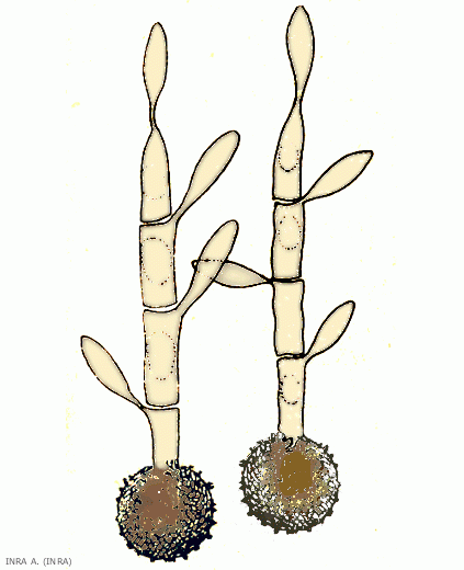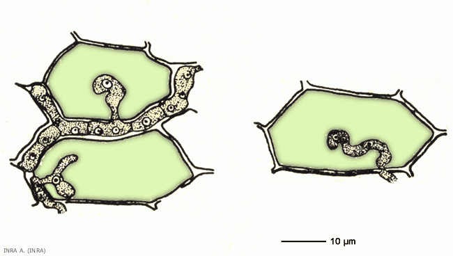 Les filaments mycéliens du champignon sont formés d'hyphes cloisonnés très ramifiés qui se développent entre les cellules et qui pénètrent dans celles-ci par des suçoirs. Ceux-ci ont des longueurs et des diamètres variables et sont vésiculaires, spiralés ou ramifiés (figure 2).