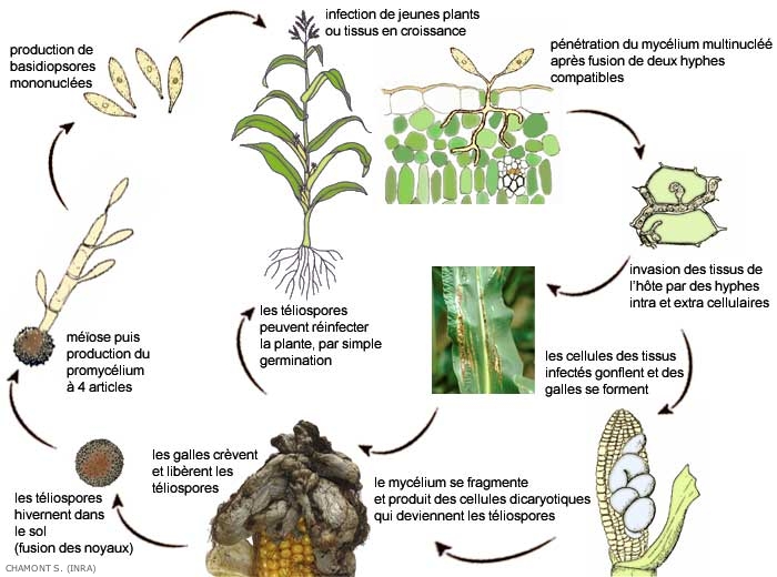La première infection du printemps par Ustilago maydis (figure 1) se fait grâce aux téleutospores noires, provenant des cultures charbonnées des années précédentes, et restées dans le sol. Effectivement, ces spores peuvent survivre de nombreuses années dans le sol et les débris végétaux (deux à trois ans) en gardant la faculté de germer.