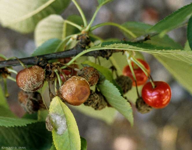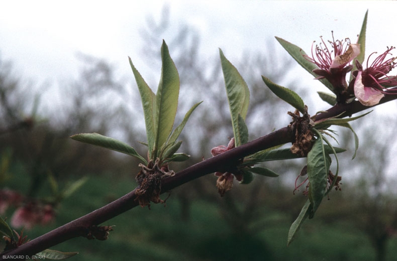 M. laxa provoque la destruction des bouquets floraux ce qui se traduit par le flétrissement et le desséchement des fleurs («blossom-blight», figure 8). L'infection s'étend ensuite jusqu'au rameau porteur du bouquet et l'on observe le dessèchement des jeunes feuilles qui restent attachées au rameau.