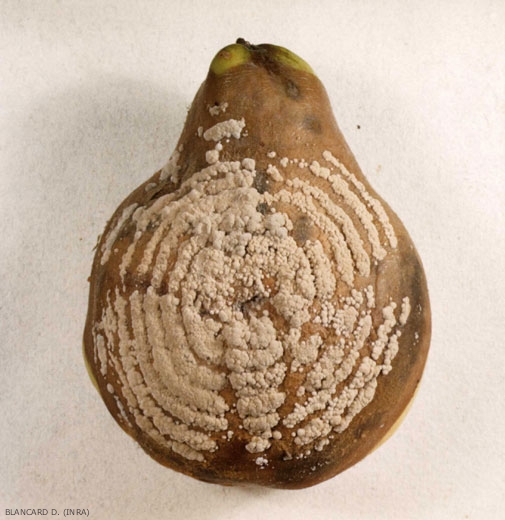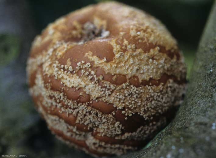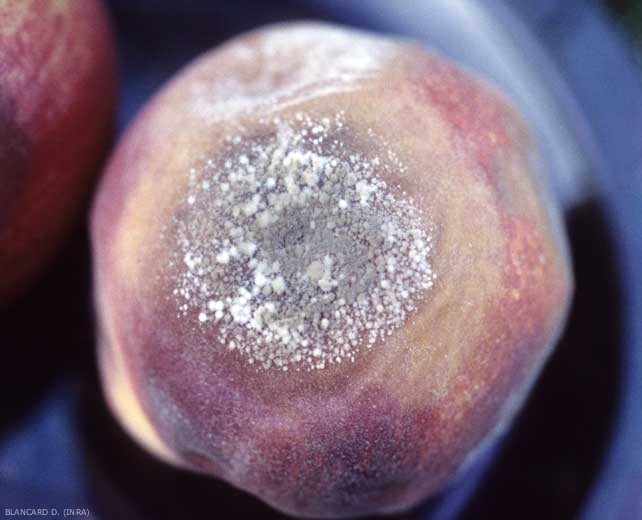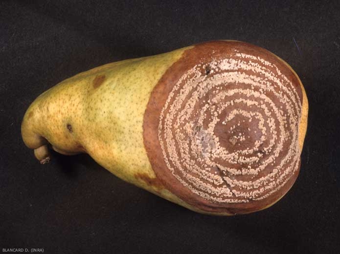 - pour les fruits en conservation prolongée (pommes, poires, coings), il apparaît à la surface du fruit une tache marron au contour noir avec des coussinets blancs plus compacts situés autour de la tache. La chair du fruit est, quant à elle, entièrement noircie.