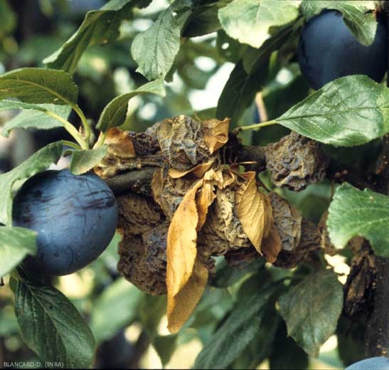 - quand les fruits sont encore verts, si le temps est humide, les fruits tombent et pourrissent ; si au contraire le temps est sec, les fruits se dessèchent sur l'arbre et deviennent des « momies » (figure 5) qui resteront tout l'hiver (voire deux hivers). D'une manière générale, le champignon émet de nombreux coussinets sur les fruits, le pédoncule et les feuilles avoisinantes et l'infection peut se répandre jusqu'au rameau ;