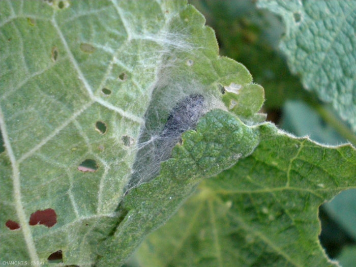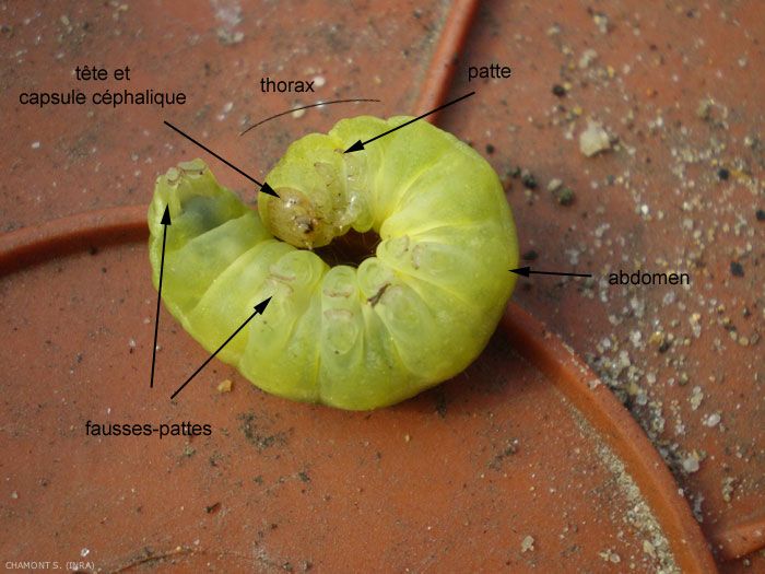 - chenille (figure 3) : larve des lépidoptères. Le corps est mou, allongé. La tête, petite mais distincte, comprend une capsule céphalique fortement sclérifiée, des antennes courtes, plusieurs petits yeux simples et des pièces buccales broyeuses. Le thorax porte 3 paires de pattes articulées très courtes, terminées par une griffe. La partie supérieure du 1er segment thoracique est appelée écusson ou plaque thoracique. L'abdomen porte des fausses-pattes ventrales (typiquement 4 paires), et une paire à l'extrémité postérieure, toutes garnies de spicules. La plupart des chenilles se nourrissent de végétaux vivants et certaines espèces sont des ravageurs très redoutés.