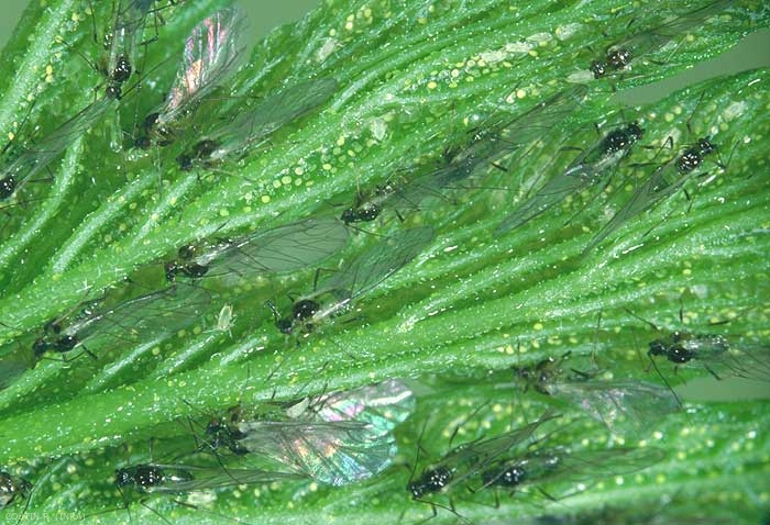 Le miellat forme sur la face supérieure des feuilles une couche brillante et collante, envahie par la fumagine, et l'assimilation chlorophyllienne s'en trouve réduite.