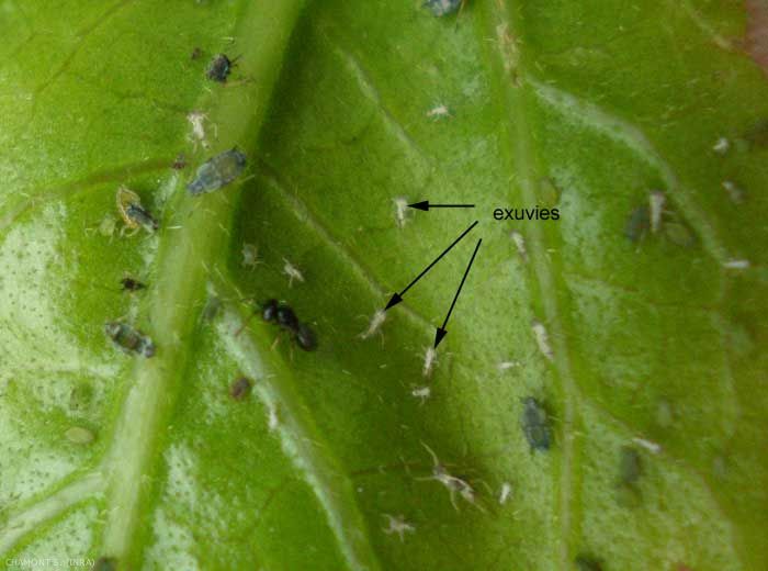 - miellat (figure 2) : excréments liquides, riches en sucres et en acides aminés, des hémiptères, déposés sur les feuilles ou projetés par les pattes postérieures. Le miellat brûle les feuilles, qui souffrent par ailleurs de la diminution de leur photosynthèse due au développement de la fumagine.