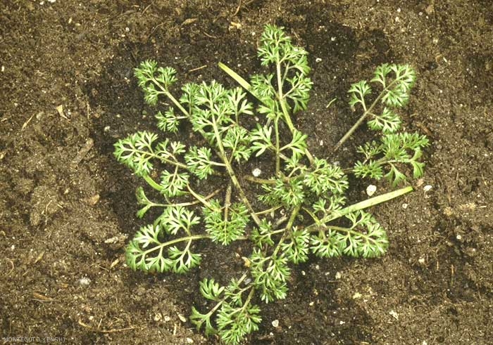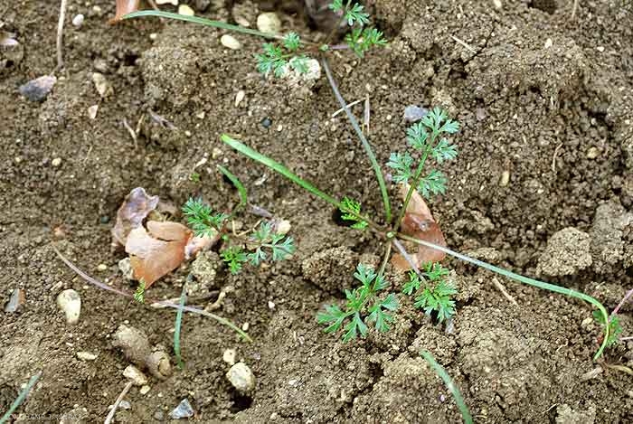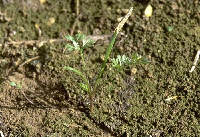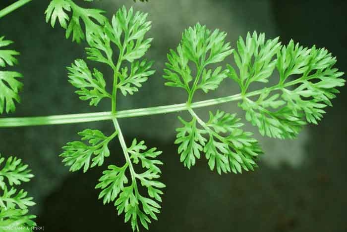 Feuilles ovales dans leur pourtour, bi-tripennatiséquées, découpées en lobes linéaires, mucronulés, rudes aux bords. Accentuation de la découpure et de la pilosité des feuilles au fur et à mesure. Pétiole canaliculé, pubescent. Présence d'une gaine à la base ;
