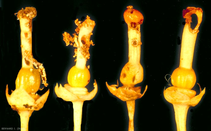 Les boutons floraux, les fleurs et les très jeunes fruits sont perforés. Ceux-ci attaqués préférentiellement par les larves se dessèchent et meurent (figure 2).