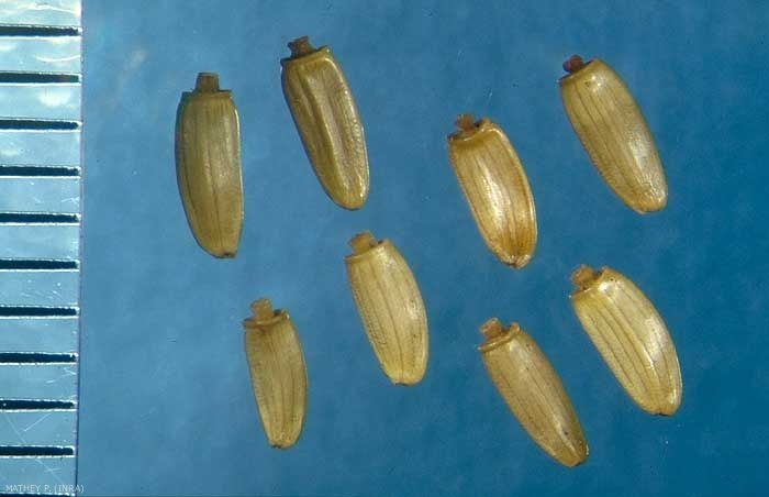 Forme : conoïde, ovoïde à ellipsoïde plus ou moins aplanie, tronquée au sommet et à base arrondie à ombilic hilaire latéral. Aigrette sessile blanche à soies non plumeuses ; souvent caduque