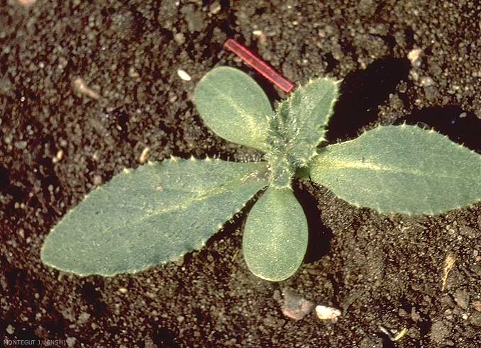 Feuilles inférieures disposées en rosette. Feuilles de la tige se prolongeant en ailes le long de la tige. Feuilles plus ou moins blanches et tomenteuses en dessous