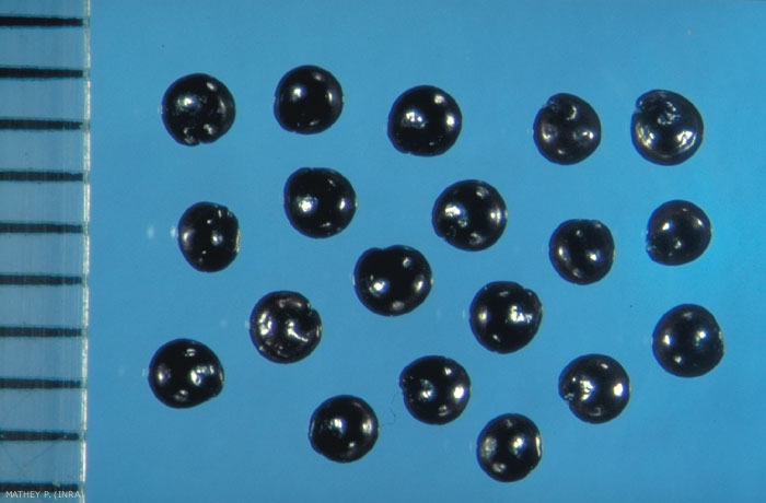 Forme : semence lenticulaire avec pointe radiculaire et emplacement hilaire visibles. Amincissement équatorial sans marge distincte