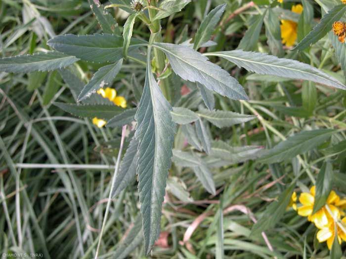 Feuilles opposées glabres linéaires, lancéolées ou profondément divisées en lobes linéaires, grossièrement et irrégulièrement dentées