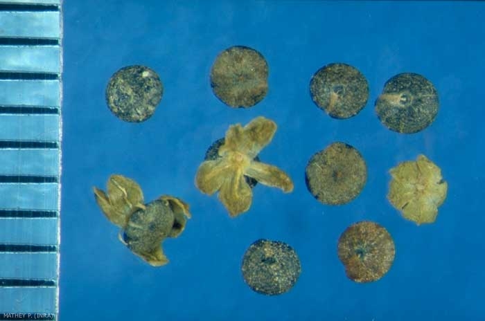 Fruit contenant les graines : akène, restes des 5 sépales souvent visibles.
