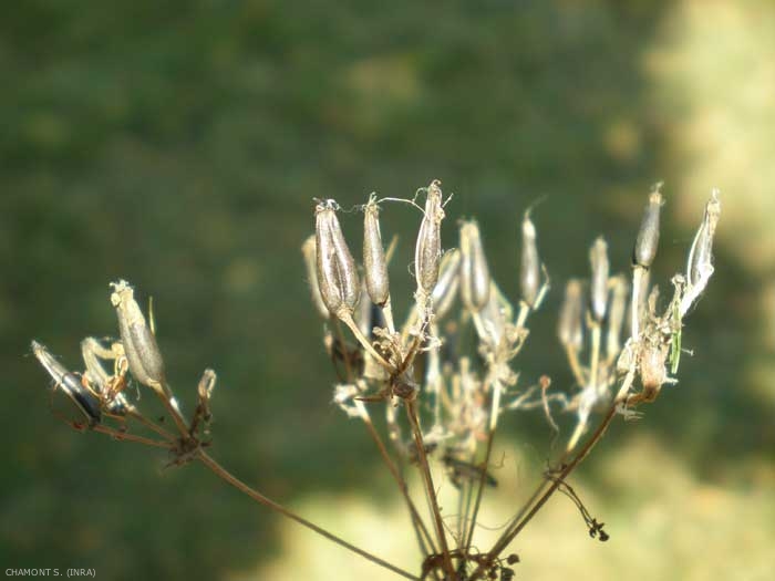 Inflorescence : ombelles terminales de 2 à 6 cm de diamètre, la première quelquefois surmontée par les rameaux latéraux. Bractées absentes, 4 à 6 bractéoles ovales, aristées, ciliées et souvent roses. Fleurs blanches de 3 à 4 mm de diamètre