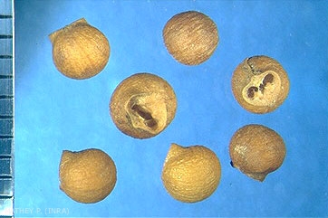 Forme : sphérique avec hile souligné par une fossette dissymétrique aplanie et ciselée, déformant l'aspect sphérique de la semence