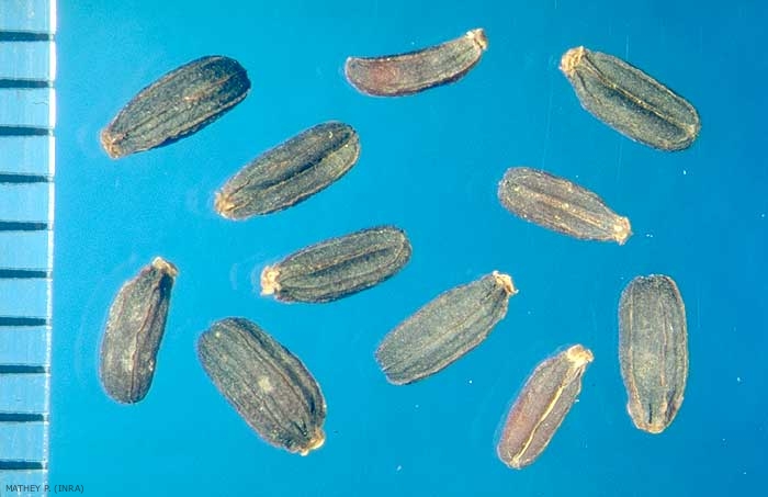 Forme : semence ellipsoïde à section plan-convexe polygonale