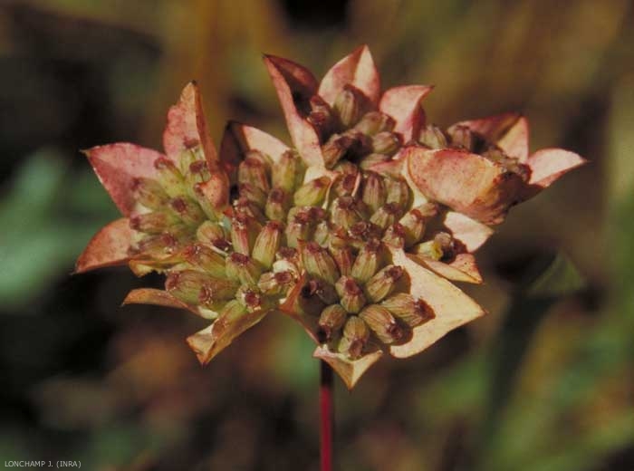 Fleurs jaunes en ombelles de 4 à 8 rayons. Pas d'involucre, involucelles à bractées ovales dressées autour des ombellules après la floraison et les dépassant largement