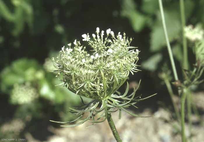 Fleurs blanches ou roses au centre de l'ombelle, pétales en forme de pique. Ombelle grande, 20 à 40 rayons grêles. Involucelle à bractées linéaires ou divisées